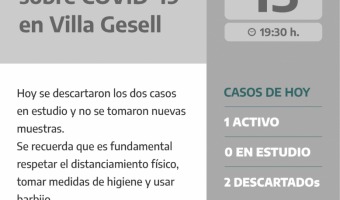 Se recibieron los resultados de 5 casos en estudio, de los cuales 1 dio positivo para COVID-19. Lo que da como resultado un total de 12 casos activos.