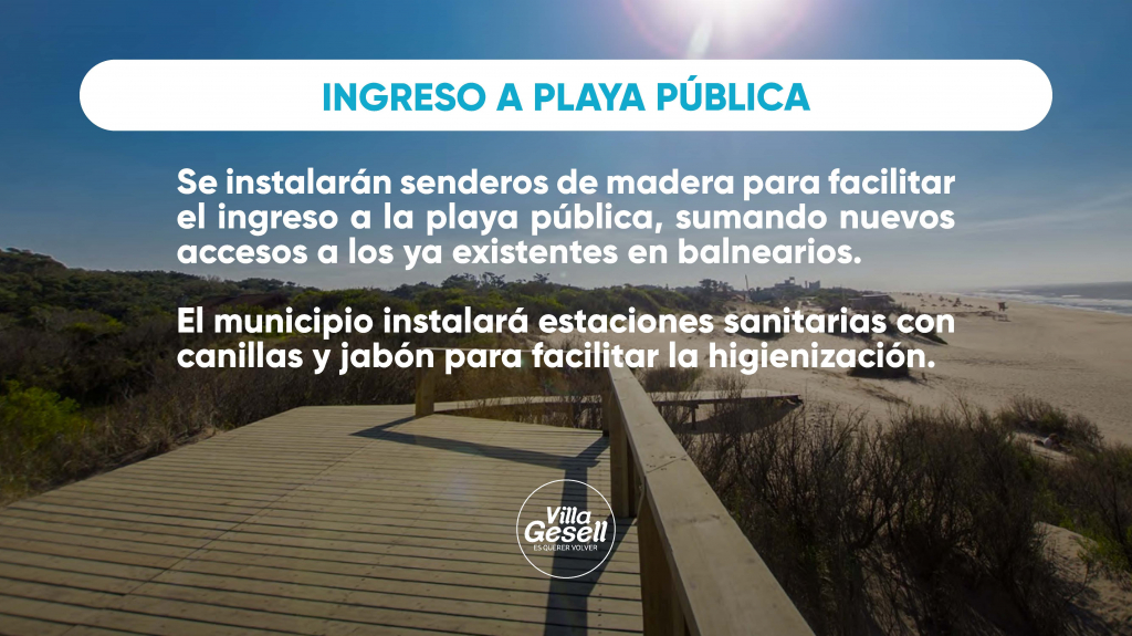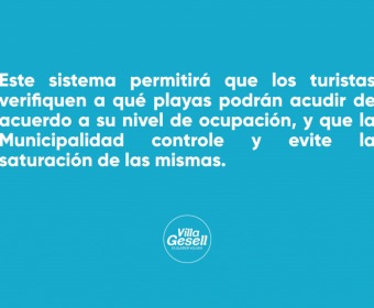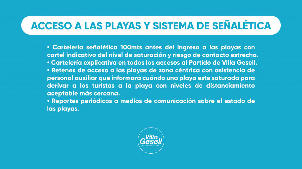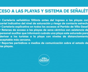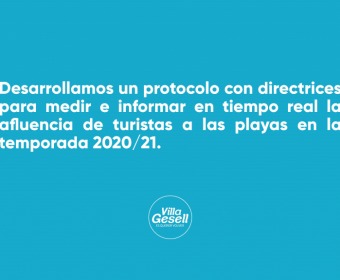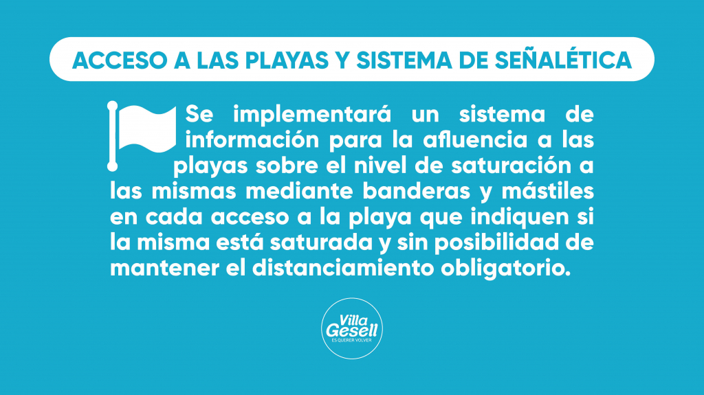 El secretario de Turismo, Emiliano Felice, explicó en detalle el protocolo y directrices para balnearios y playa pública y manifestó que el plan busca poder disfrutar del destino en general y sus playas en particular con medidas de distanciamiento e higiene. Según explicó, el sistema se basa en la información mediante el uso de herramientas de señalética, como el uso de una bandera verde para informar la disponibilidad de la playa y una bandera roja para informar cuando la playa alcanzó su cupo máximo de ocupación. A su vez, se prevé que, a 100 metros del ingreso a la playa, haya personal auxiliar que informe sobre la disponibilidad de esa playa y qué playas tienen lugar, y una aplicación para celulares y la web de Turismo Villa Gesell brindará información sobre el estado de las playas.