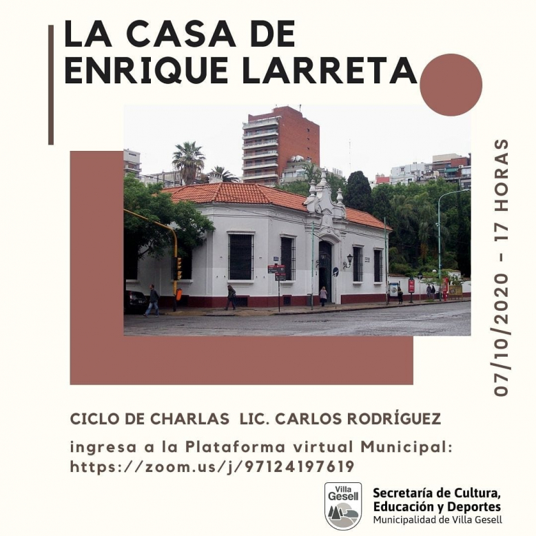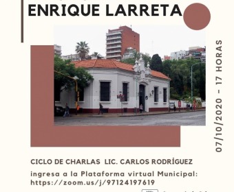 En el marco del ciclo de charlas “Tesoro de los palacetes porteños”, este miércoles 7 de octubre, a las 17 horas, por medio de la plataforma virtual municipal, el licenciado Carlos Rodríguez, continuará con el ciclo de charlas y conversará acerca de Enrique Larreta.