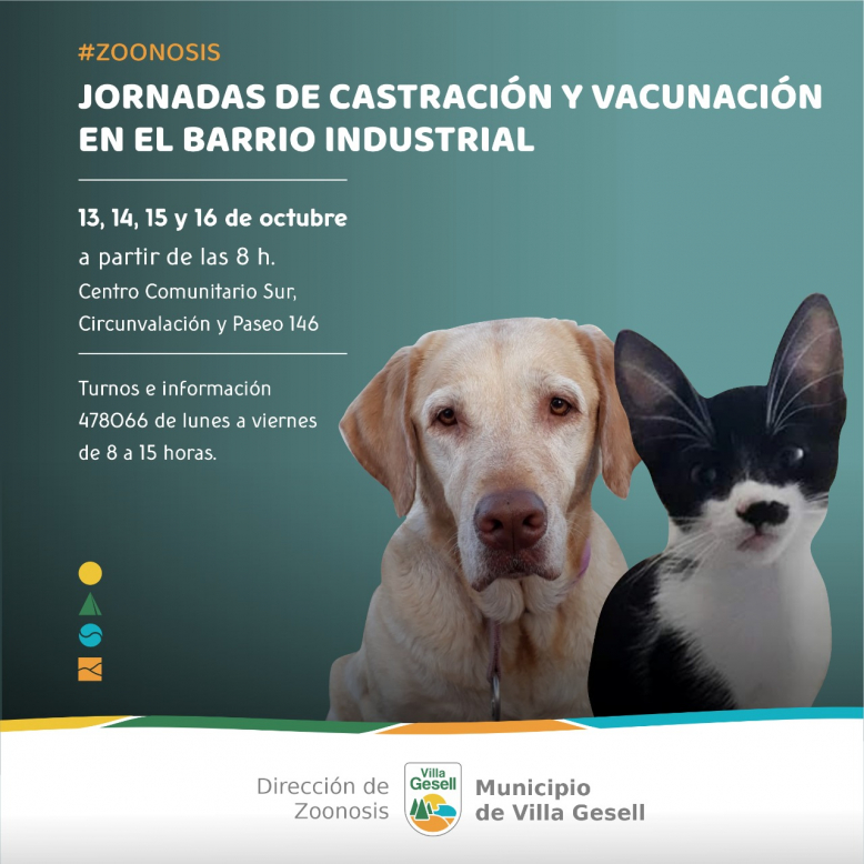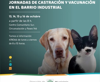 Los días 13, 14,15 y 16 de octubre, la Dirección de Zoonosis, llevará a cabo jornadas de castraciones y vacunas antirrábicas en el Centro Comunitario Sur, ubicado en Circunvalación y Paseo 146, a partir de las 8h.