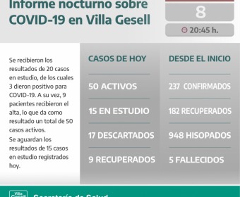 Desde el inicio de la pandemia, Villa Gesell registra 237 casos confirmados por COVID-19, entre los cuales 50 se encuentran activos, 182 pacientes recibieron el alta y 5 fallecidos.
