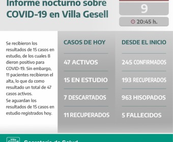 Desde el inicio de la pandemia, Villa Gesell registra 245 casos confirmados por COVID-19, entre los cuales 47 se encuentran activos, 193 pacientes recibieron el alta y 5 fallecidos.
