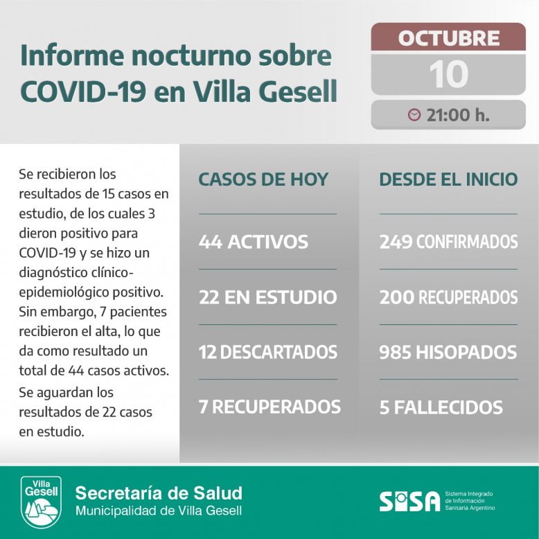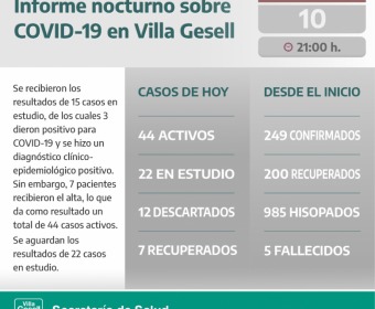 Desde el inicio de la pandemia, Villa Gesell registra 249 casos confirmados por COVID-19, entre los cuales 44 se encuentran activos, 200 pacientes recibieron el alta y 5 fallecidos.