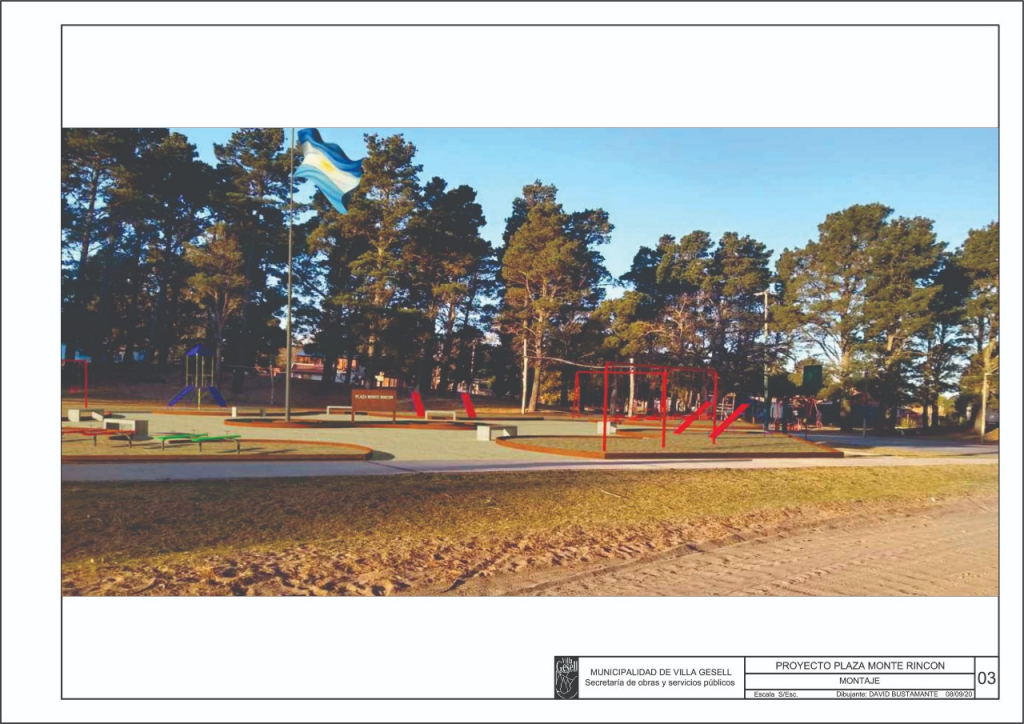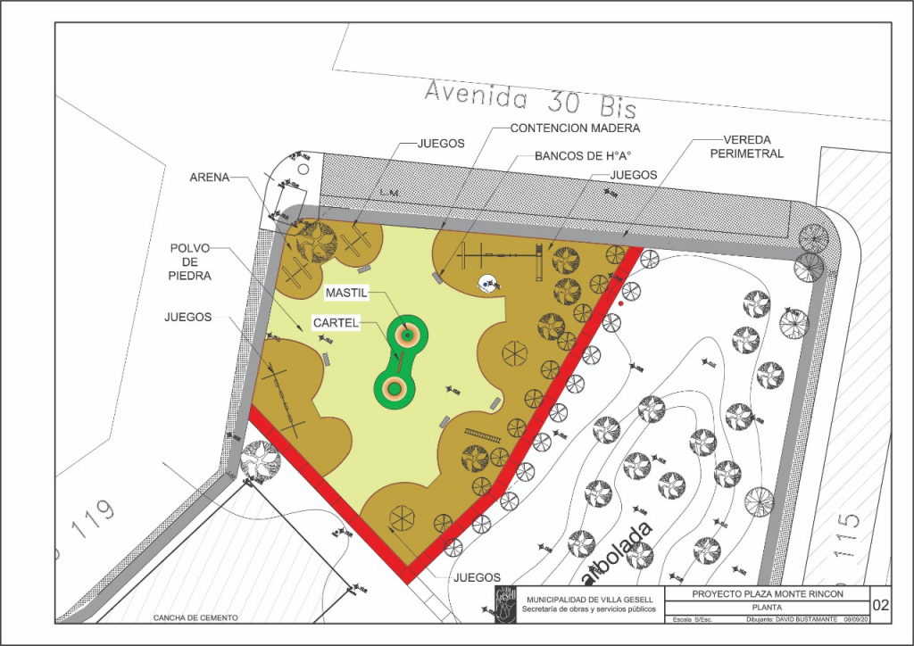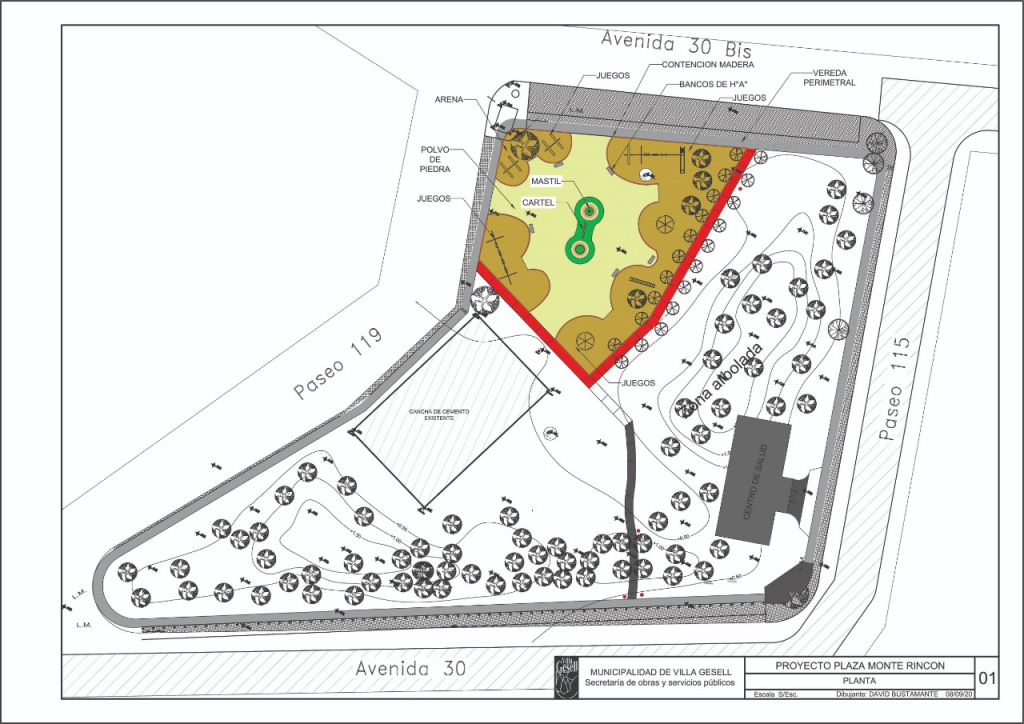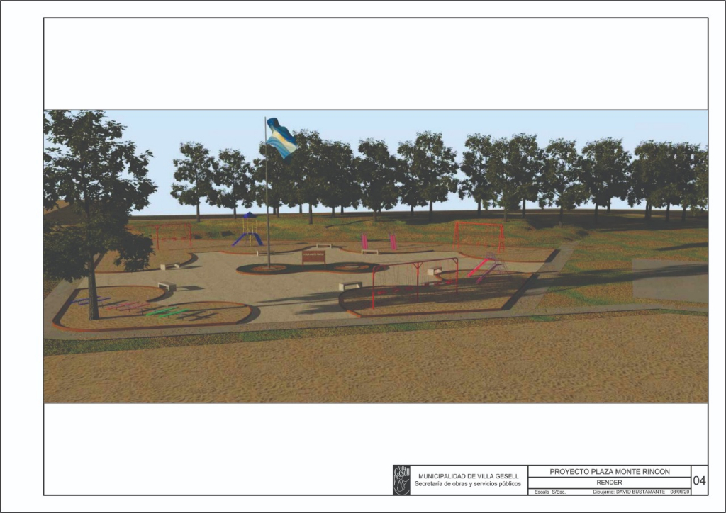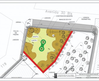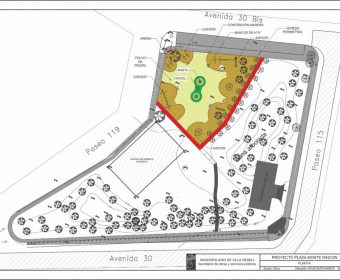 Las obras se desarrollarán frente a la escuela 4, en Avenida 30 bis entre Paseo 119 y Paseo 115. En el gráfico se puede ver el detalle del proyecto que incluye nuevos juegos, bancos y embellecimiento del espacio público con polvo de piedra y veredas.
