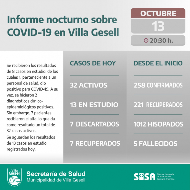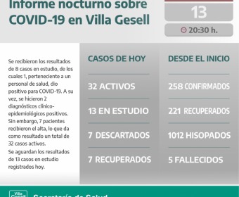 Desde el inicio de la pandemia, Villa Gesell registra 258 casos confirmados por COVID-19, entre los cuales 32 se encuentran activos, 221 pacientes recibieron el alta y 5 fallecidos.