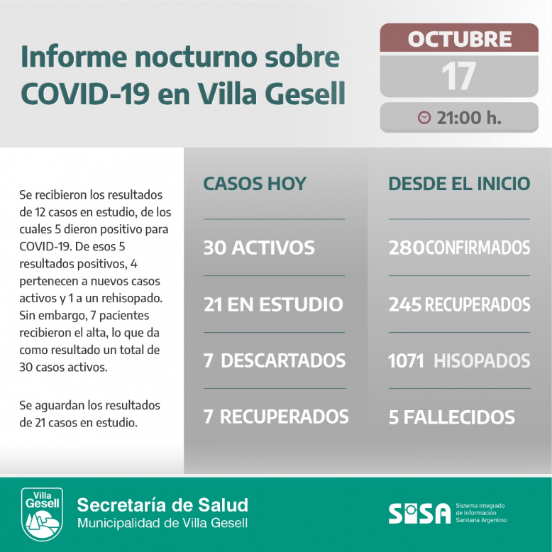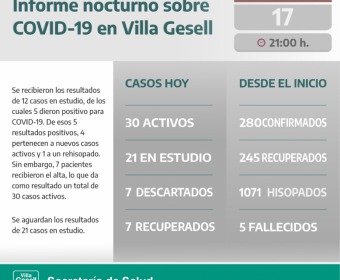 Desde el inicio de la pandemia, Villa Gesell registra 280 casos confirmados por COVID-19, entre los cuales 30 se encuentran activos, 245 pacientes recibieron el alta y 5 fallecidos.