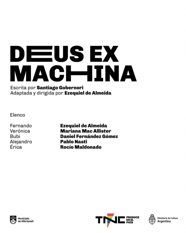 "Deus Ex Machina" fue seleccionada entre un total de 109 proyectos presentados durante 2022, junto con otras seis propuestas teatrales. El elenco de la obra está compuesto por destacados artistas geselinos: Pablo Nasti, Daniel Fernández, Rocio Maldonado, Mariana Mac Allister y Ezequiel de Almeida, quien también la dirige.
