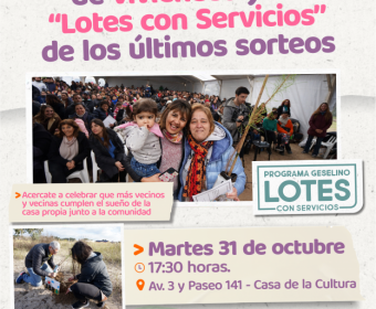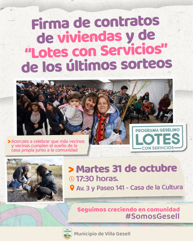 Mañana martes 31 de octubre es un día muy importante para las políticas de hábitat en Villa Gesell, ya que se realizarán anuncios y se firmarán contratos de viviendas y de los Lotes con Servicios, sorteados en las últimas jornadas.