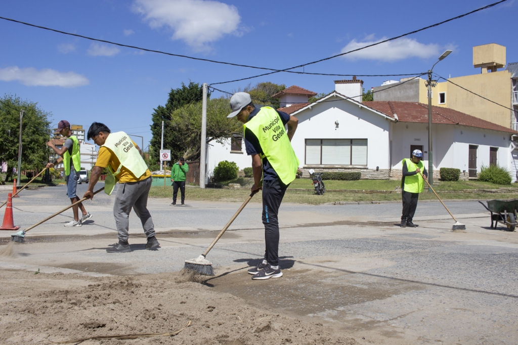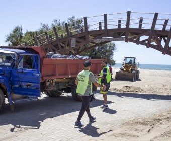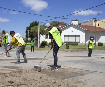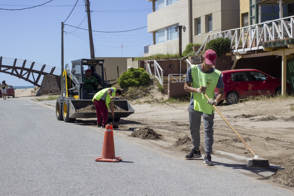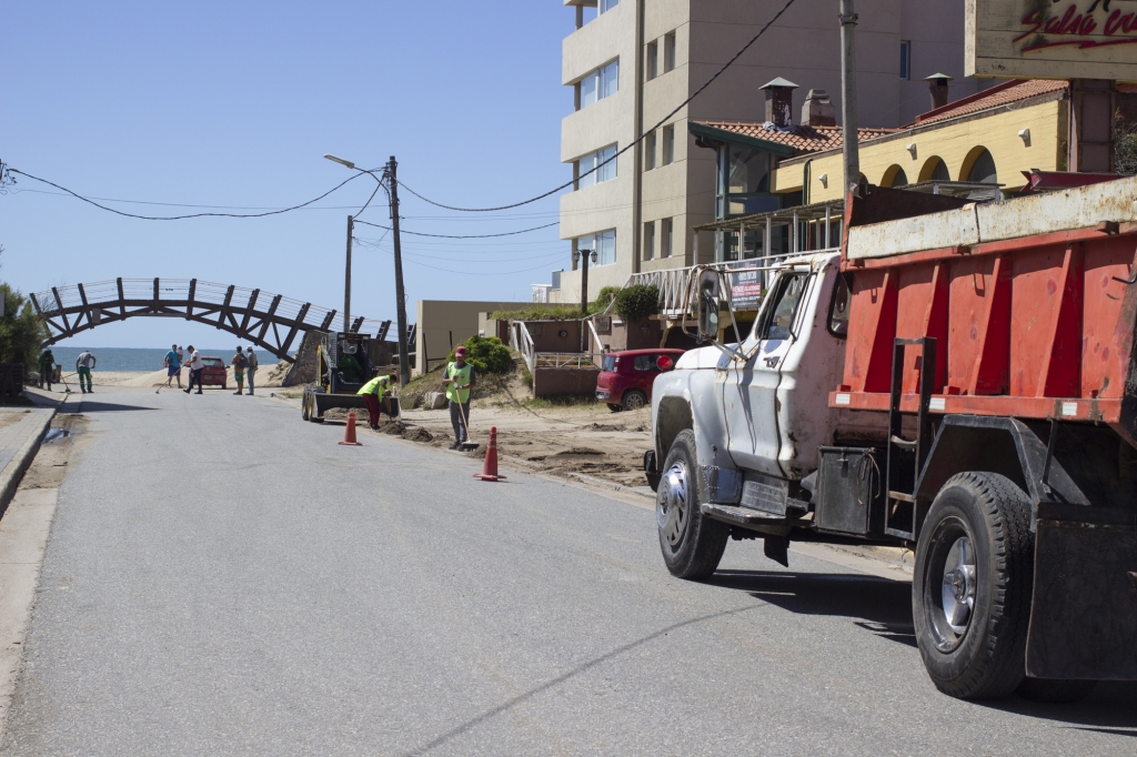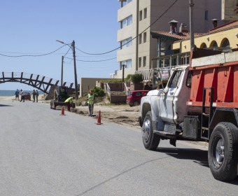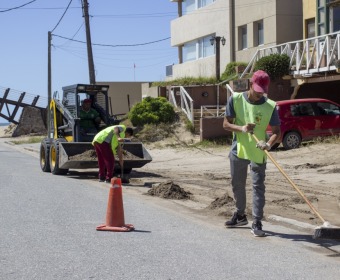 El área a cargo de Carolina Chinni se encuentra trabajando, con el aporte de maquinaria pesada, en el retiro de arena sobre la costanera y efectuando la limpieza y el barrido de los accesos, para mejorar su acondicionamiento.