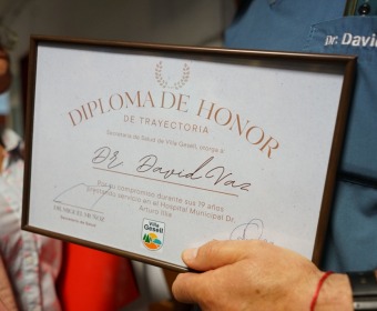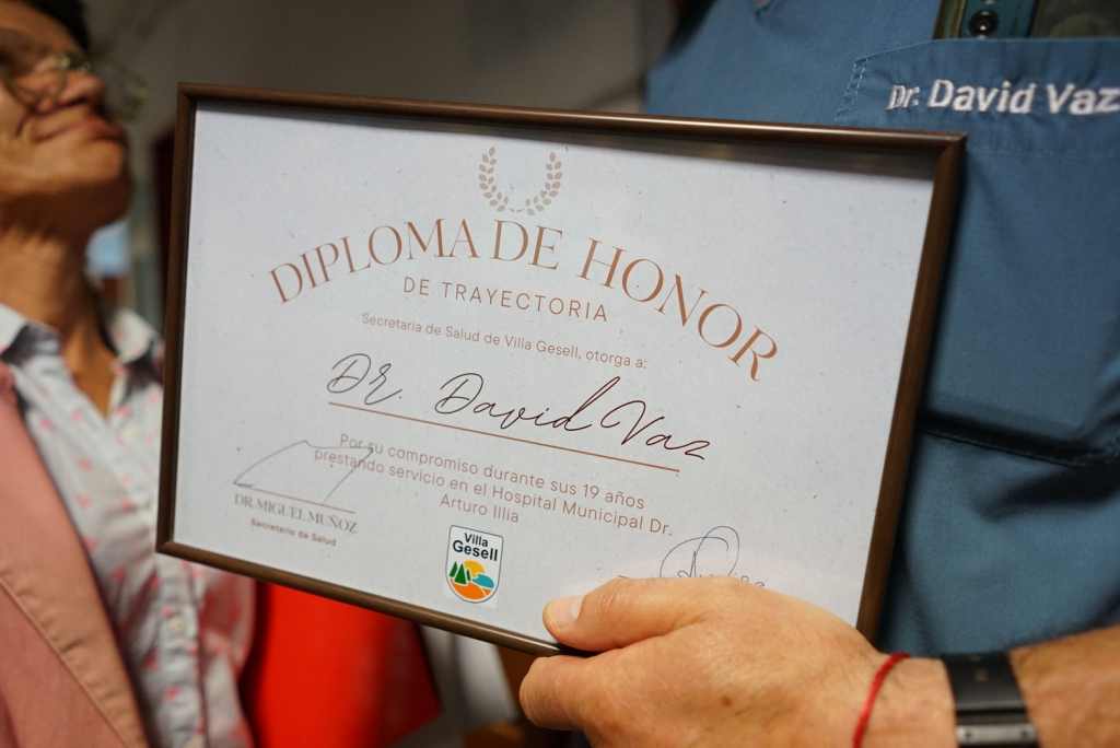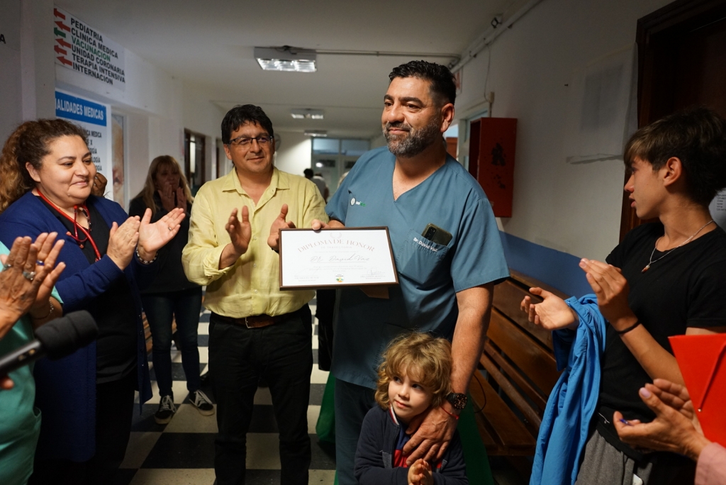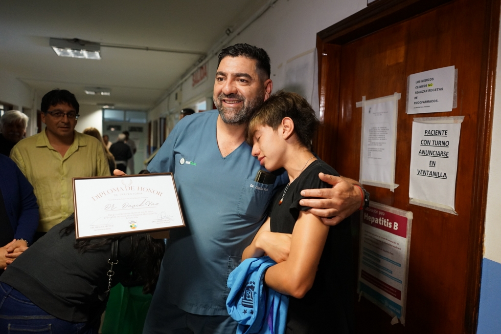 Luego, se entregó un diploma de honor por la trayectoria al Dr. David Vaz, ginecólogo y obstetra, que dejará la ciudad para continuar su carrera profesional en San Martín de los Andes. La noticia emocionó a los presentes y su esposa Malen, sus hijos, Benjamin, Nicolás, Florencia y Carolina le dedicaron unas palabras de cara a estos nuevos proyectos.