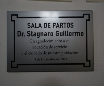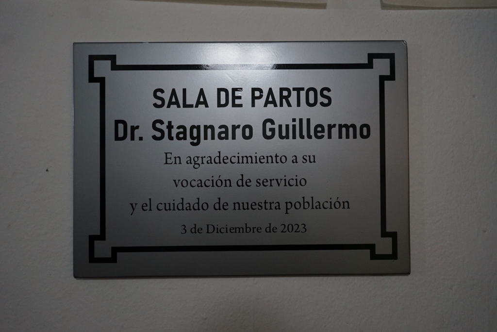 En principio, se descubrió una placa en la sala de partos del nosocomio en memoria del Dr. Guillermo Stagnaro. Su esposa y el secretario de Salud, Miguel Angel Muñoz, fueron los encargados de esta tarea, en reconocimiento a dicho profesional de la salud de amplia trayectoria, que falleció en el año 2021.