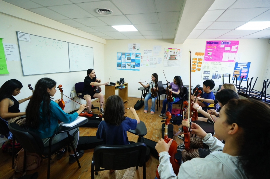 Las opciones de enseñanza incluyen clases de Violín, Teclado, Percusión, Guitarra, Práctica Coral, Lenguaje Musical y preparación para FOBA (Formación Orquestal y Bandística de Argentina).