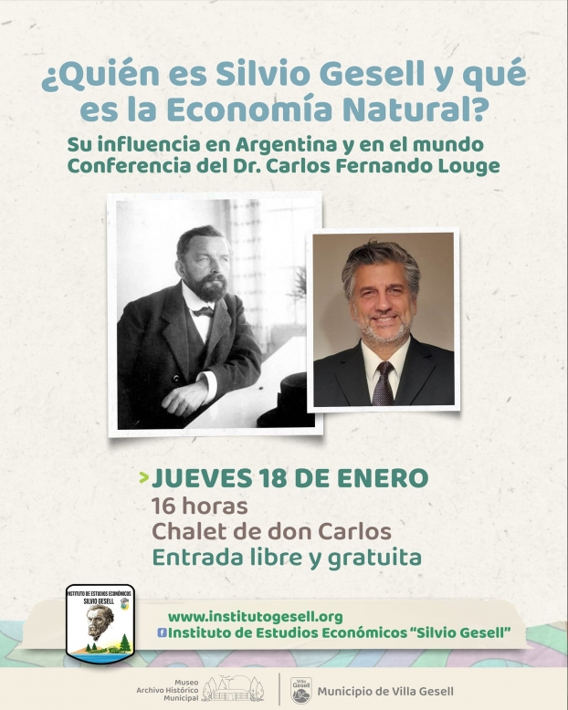 Bajo el nombre: “¿Quién es Silvio Gesell y qué es la Economía Natural? Su influencia en la Argentina y en el mundo“, la charla estará a cargo del Dr. Carlos Fernando Lounge, Director del Instituto de Estudios Económicos Silvio Gesell, organización que desde hace más de dos décadas reúne a investigadores y profesionales, de distintos países y vertientes ideológicas, para profundizar sobre los postulados de la Economía Natural. En este ámbito, se debaten experiencias y teorías sobre el desarrollo productivo, social, ambiental, fiscal y monetario, aplicables a las economías locales, regionales, nacionales e internacionales.