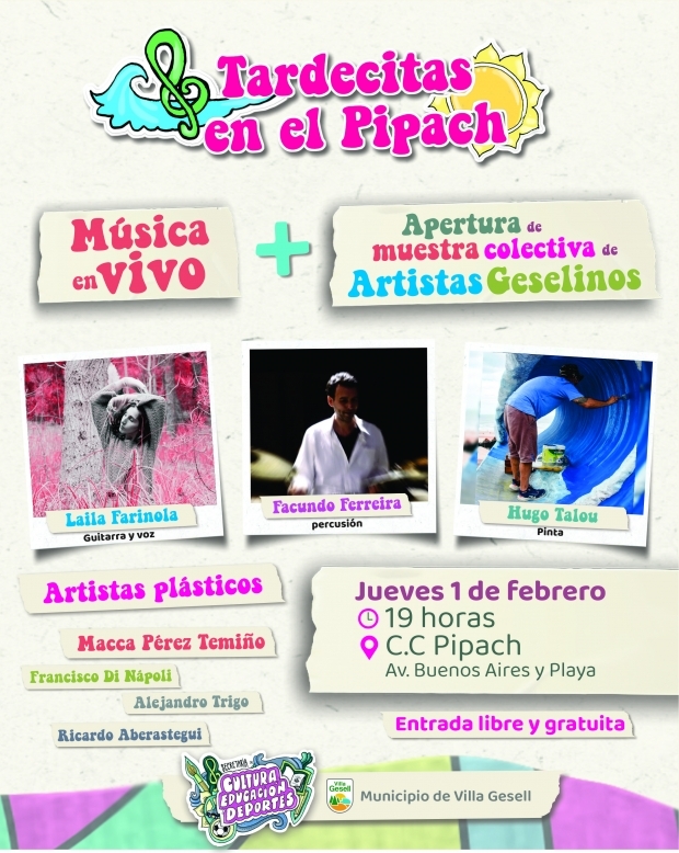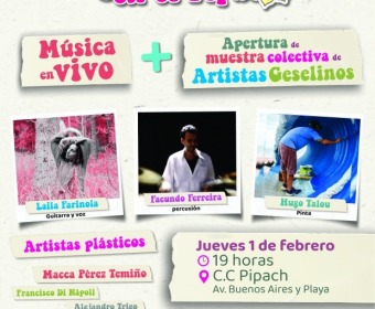 En esta ocasión, el Centro Cultural Pipach será el escenario de una tarde musicalizada por Laila Farinola y Facundo Ferreira. Además, también se podrá contemplar la apertura de una muestra colectiva de artistas geselinos, entre los cuales se encuentran Hugo Talou, Director de Promoción de las Artes, Maca Perez Temiño, Francisco Di Napoli, Alejandro Trigo y Ricardo Aberastegui.