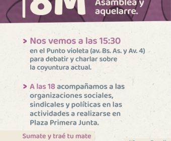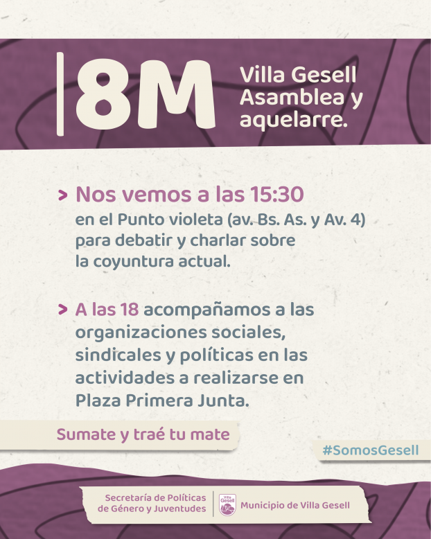 A partir de las 15:30 horas, en el Punto Violeta (Multiespacio Norte - Av. Buenos Aires y Av. 4), se llevará a cabo una Asamblea Popular de convocatoria abierta. El encuentro tiene como objetivo debatir los efectos de la coyuntura local y la situación en Villa Gesell en materia de género.