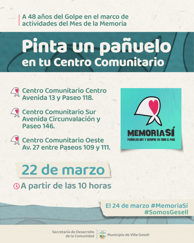 En ese sentido, se convoca a pintar pañuelos en los Centros Comunitarios más cercanos a cada barrio. Esta iniciativa busca promover la reflexión y el recuerdo de nuestro pasado, honrando la memoria de quienes lucharon por la justicia y la verdad.