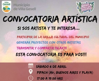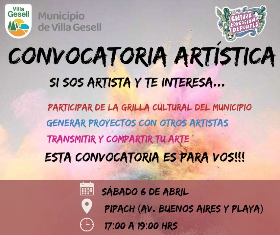 Te esperamos el próximo sábado 6 de abril en el Centro Cultural Pipach a las 17:00 h. Allí, se realizará un primer encuentro entre los y las artistas de nuestra ciudad junto a la Dirección de Promoción de las Artes, a cargo de Hugo Talou, donde iniciaremos una serie de reuniones informales para conocernos, intercambiar ideas y comenzar a planificar actividades culturales para el año.