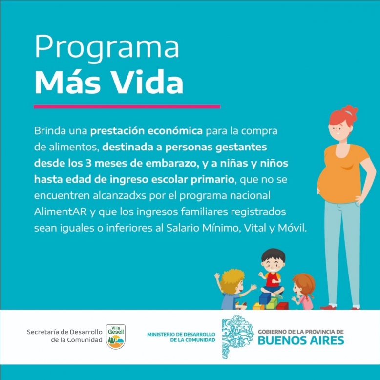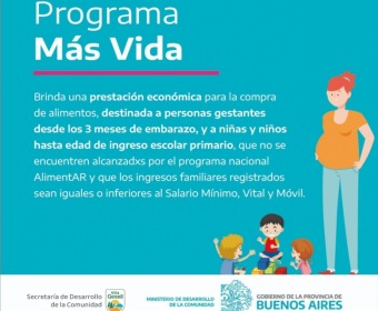El programa “Más Vida” brinda una prestación económica para la compra de alimentos, destinada a personas gestantes desde los 3 meses de embarazo y a niñas, niños hasta la edad de ingreso escolar primario, que no se encuentren alcanzados por el programa nacional AlimentAR y que los ingresos familiares registrados sean iguales o inferiores al Salario Mínimo, Vital y Móvil.