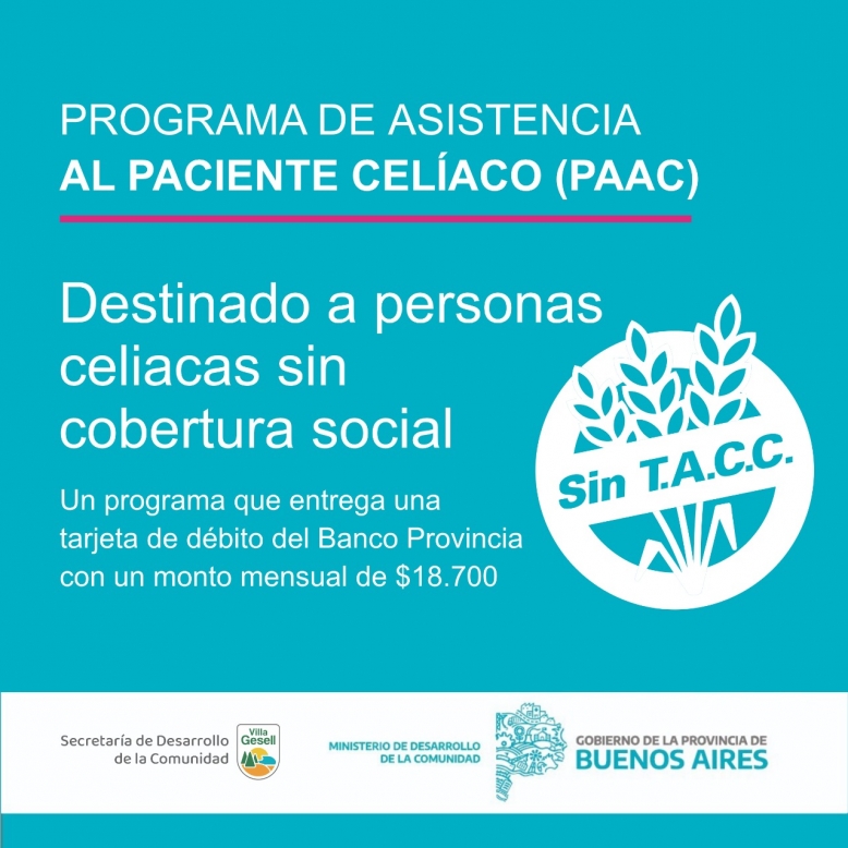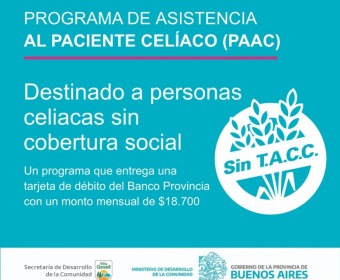 El programa de asistencia al paciente celíaco (PAAC) está destinado a personas celíacas sin cobertura social. Un programa que entrega una tarjeta de débito del Banco Provincia con un monto mensual de $18.700.