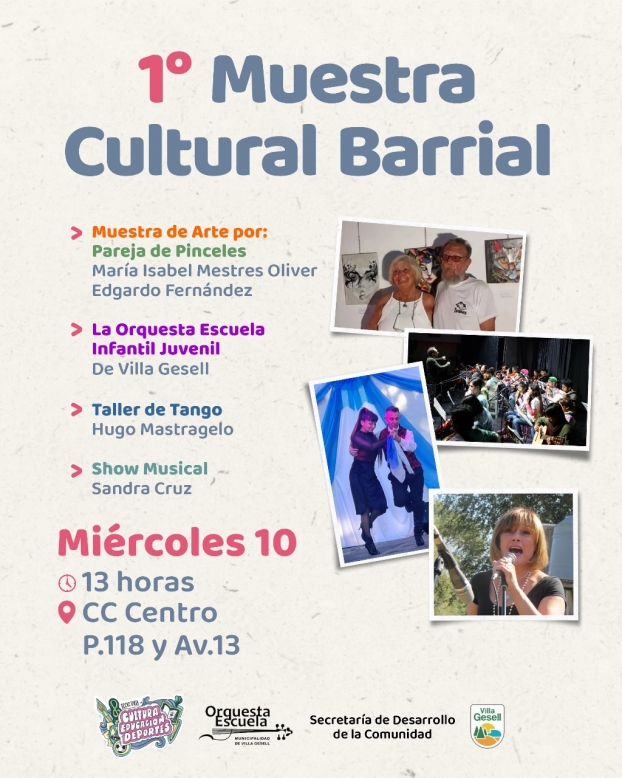 La actividad contará con una muestra de arte por pareja de pinceles, a cargo de María Isabel Mestres Oliver y Edgardo Fernández, la presentación de la Orquesta Escuela Infantil y Juvenil de Villa Gesell, un taller de tango de Hugo Mastrangelo y un show musical a cargo de Sandra Cruz.