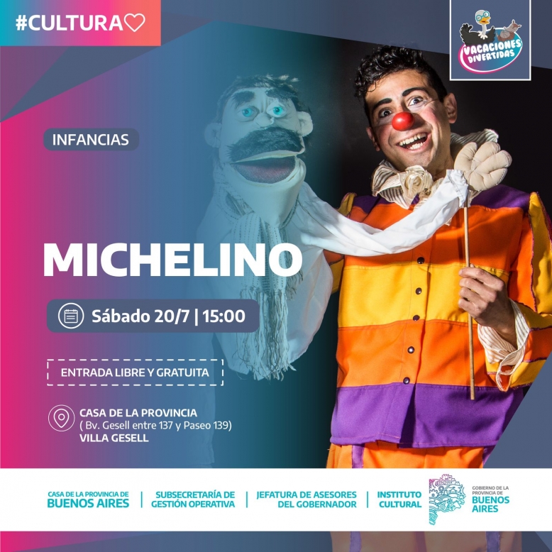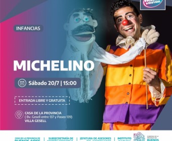 En el marco del programa 'Vacaciones Divertidas' coordinado entre el Instituto Cultural bonaerense y la Jefatura de Asesores del Gobernador, llega a nuestra ciudad el payaso Michelino, junto a su titere y amigo Roberto, quienes cuentan una historia de un circo pequeño y sin suerte.