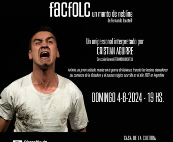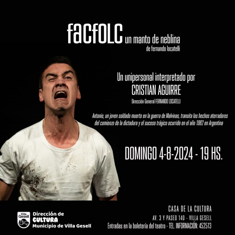 Asimismo, el domingo 4 a las 19 horas, llega “Facfolc un manto de niebla”. Se trata de un unipersonal, interpretado por Cristian Aguirre y bajo la dirección de Fernando Locatelli, que narra la experiencia de Antonio, un joven soldado muerto en la Guerra de Malvinas, y cómo transita los hechos aterradores del comienzo de la dictadura y el suceso trágico ocurrido en el año 1982 en Argentina. Las entradas están a la venta en la boletería de la Casa de la Cultura.