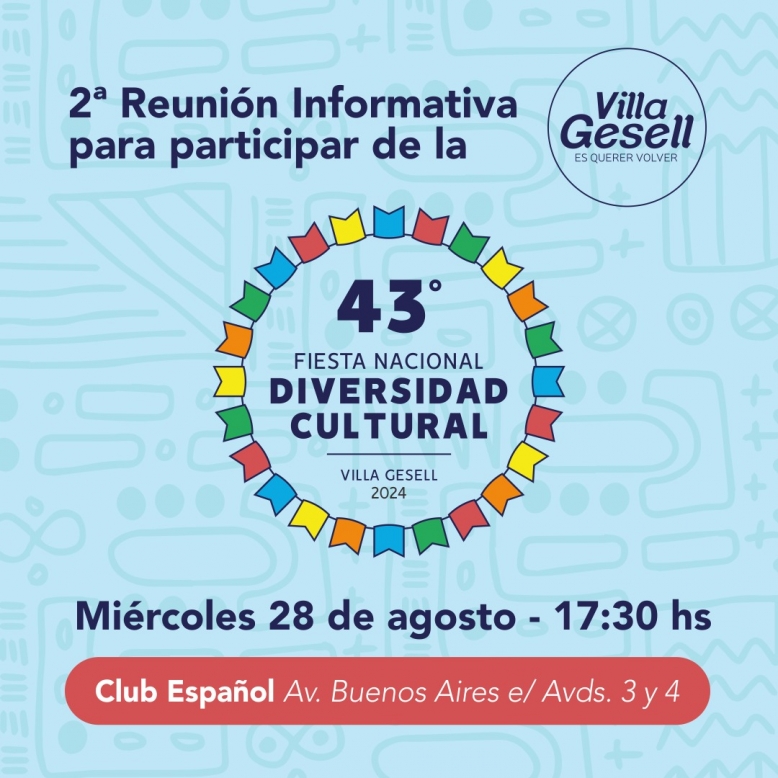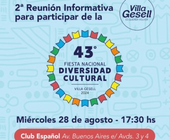 La Municipalidad de Villa Gesell, a través de la Secretaría de Turismo, invita a los artesanos locales, productores cerveceros locales, foodtrucks, pupas dulces locales y colectividades a participar de la 2° reunión informativa, en la que se darán a conocer los requisitos necesarios para la participación en la próxima edición de la Fiesta Nacional de la Diversidad Cultural, a realizarse del 11 al 13 de octubre.