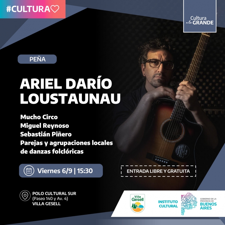 En esta oportunidad, la Peña"Cultura a lo Grande"contará con la presentación de los artistas locales y de distintas agrupaciones locales de danzas folclóricas. El cierre estará a cargo del músico Ariel Loustanau quien presentará en "El Viaje", un espectáculo con cinco músicos en escena, que a través del folclore propone un recorrido musical, con la identidad, el encuentro y el sentido de pertenencia, como sus principales tópicos.