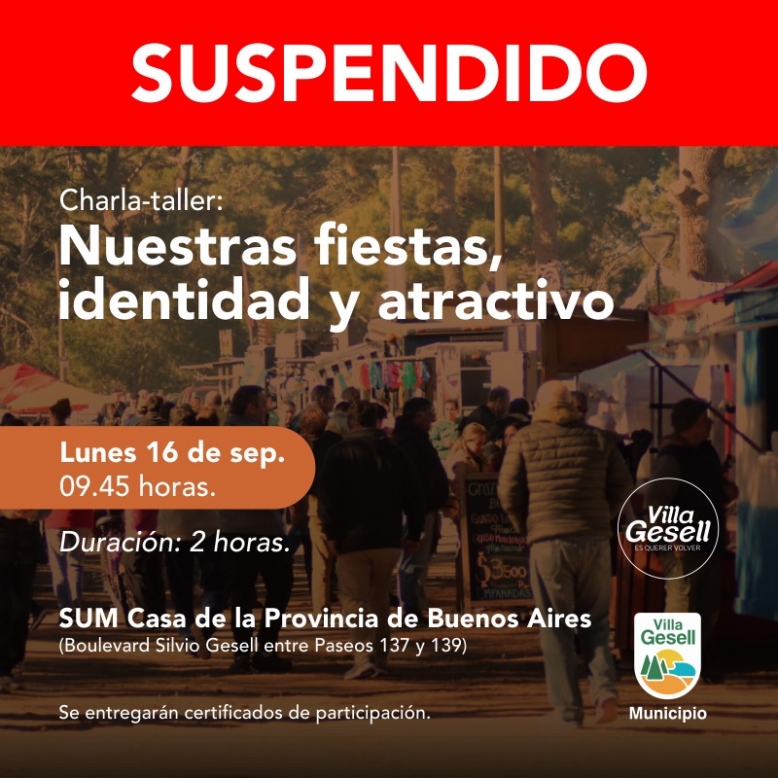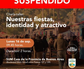 La Secretaría de Turismo informa a la comunidad que la charla-taller: “Fiestas Populares, identidad y atractivo”, prevista para el próximo lunes 16 de septiembre, se suspende por motivos ajenos a dicha Secretaría.