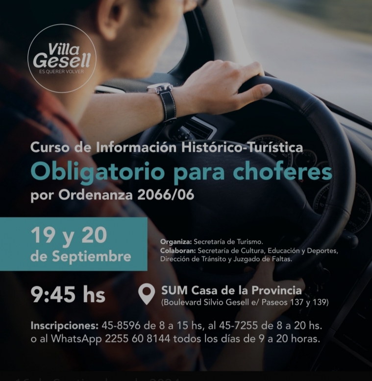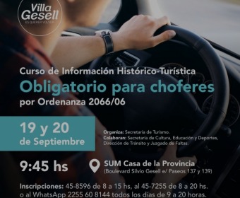 Tal como lo indica la Ordenanza 2066/06 se convoca a choferes de transporte de remis, taxis, colectivos y excursiones, personal en contacto de las empresas de transporte y público en general, a inscribirse al curso obligatorio que se dictará el jueves 19 de septiembre a las 09.45 en el Salón de Usos Múltiples de la Casa de la Provincia de Buenos Aires, ubicada en Boulevard Silvio Gesell entre Paseos 137 y 139. Así mismo, se informa que el día viernes 20 a las 10.15 horas, tendrá lugar la visita guiada con punto de encuentro en el Museo Municipal (Acceso por Alameda 202 y Calle 303).