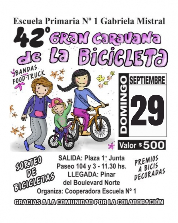 La actividad es organizada por la Cooperadora de la Escuela N.º 1, con la colaboración de la Secretaría de Cultura, Educación y Deportes del Municipio. Además, quienes deseen colaborar con la cooperadora podrán hacerlo abonando una rifa de $500, con la cual participarán del sorteo de bicicletas.