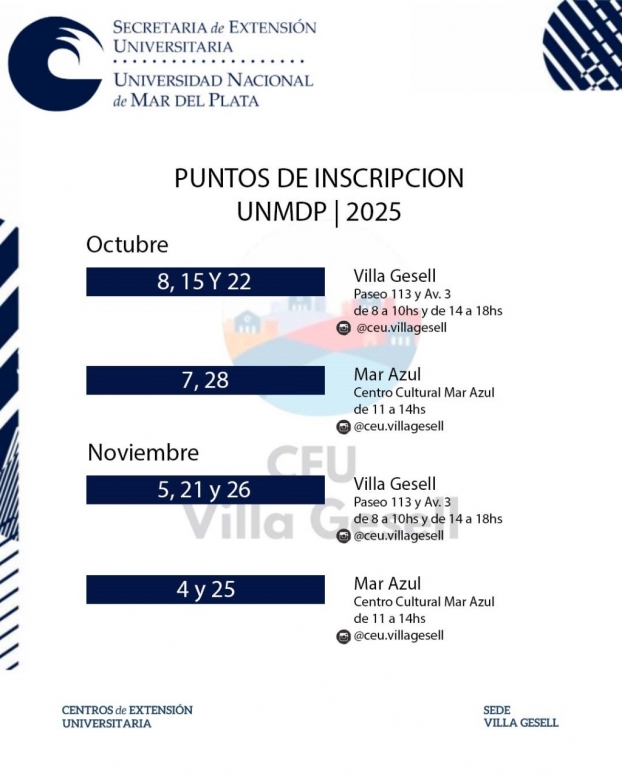 Asimismo, el Centro de Extensión Universitaria brinda la posibilidad de encuentro entre el conocimiento, la investigación y las voluntades, expectativas y perspectivas de la comunidad. En Villa Gesell comenzó a funcionar en julio del 2022, tras la firma de un convenio entre el Municipio y la Universidad.
