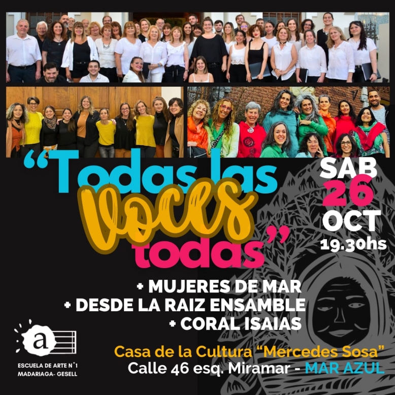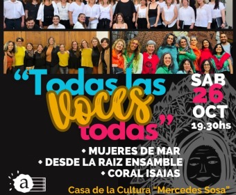 Este sábado 26 de octubre, a partir de las 19:00 horas, la Casa de la Cultura "Mercedes Sosa" de Mar Azul se llenará de música con el evento "Todas las Voces Todas", una propuesta coral única que reunirá a más de 70 voces en un concierto libre y gratuito.