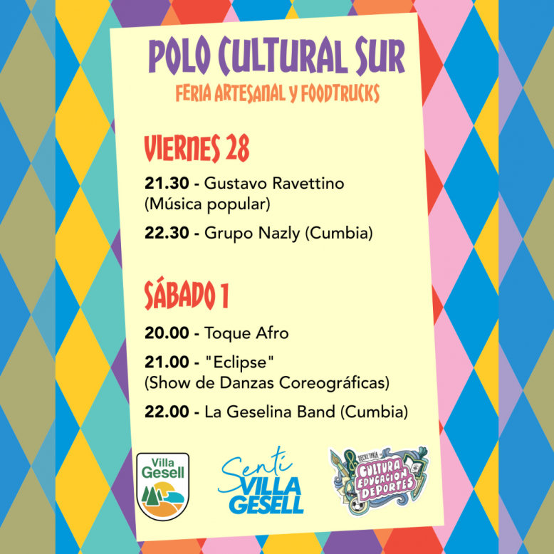 Sábado 1 a Martes 4 de 19 a 00 hs: Festejos de Carnavales. Shows en vivo, Feria Artesanal y foodtrucks.