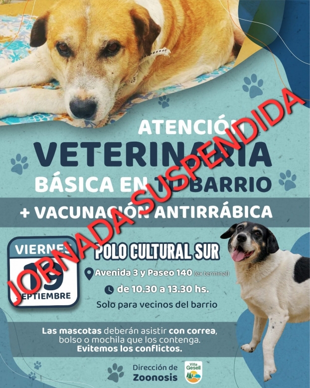 La Dirección de Zoonosis informa que, la jornada prevista para hoy desde las 10:30 hasta las 13:30 queda suspendida por cuestiones climáticas.