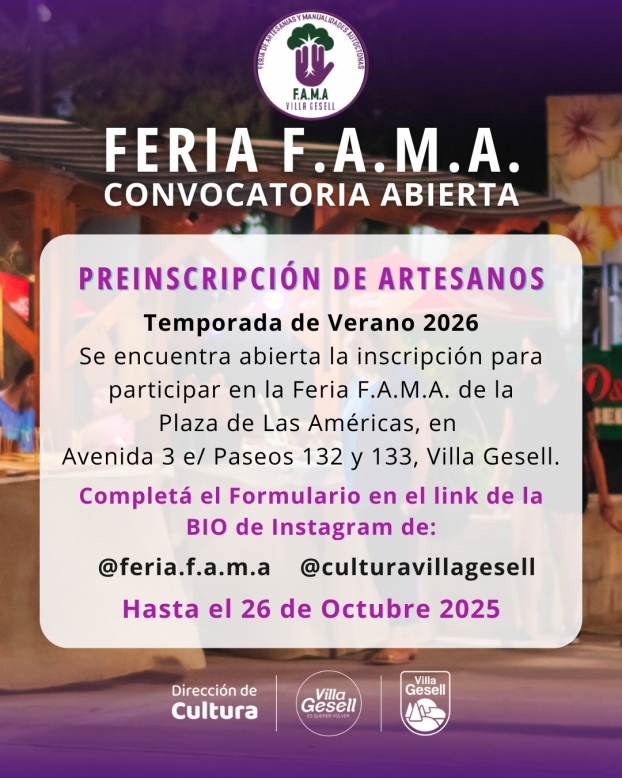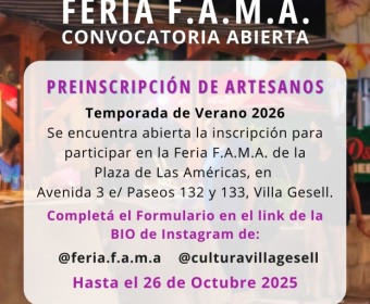 Se informa a la comunidad que ya se encuentra abierta la convocatoria para participar de la Feria F.A.M.A., que funciona en la Plaza de las Américas, ubicada en Avenida 3 entre Paseos 132 y 133. La inscripción permanecerá disponible hasta el 26 de octubre.