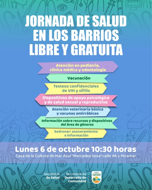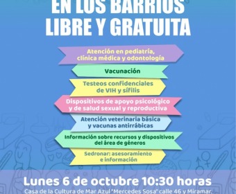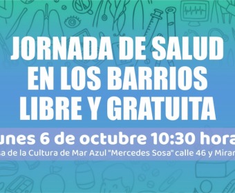 El lunes 6 de octubre, a partir de las 10:30 h, se realizará una nueva jornada de salud en la Casa de la Cultura de Mar Azul, ubicada en calle 46 y Miramar. La propuesta es impulsada por la Secretaría de Desarrollo de la Comunidad y la Dirección de Atención Primaria de la Salud, con el objetivo de acercar atención médica y diversos dispositivos a la comunidad.