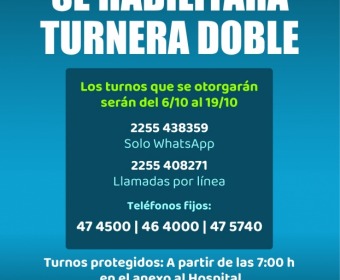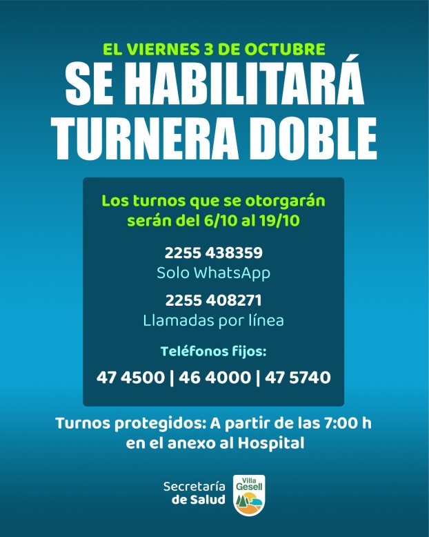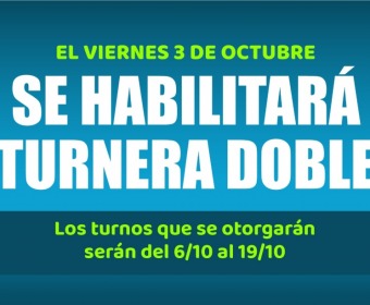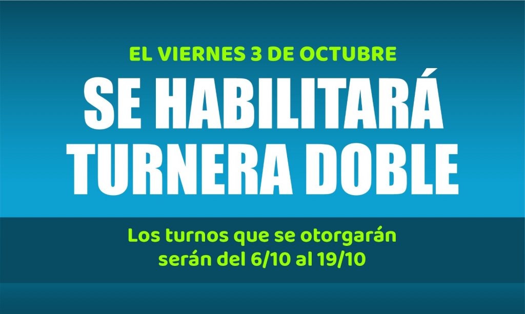 Con motivo del fin de semana largo por la Fiesta Nacional de la Diversidad Cultural, desde mañana viernes 3 de octubre se habilitará la turnera doble, con turnos que abarcarán el período del 6 al 19 de octubre.