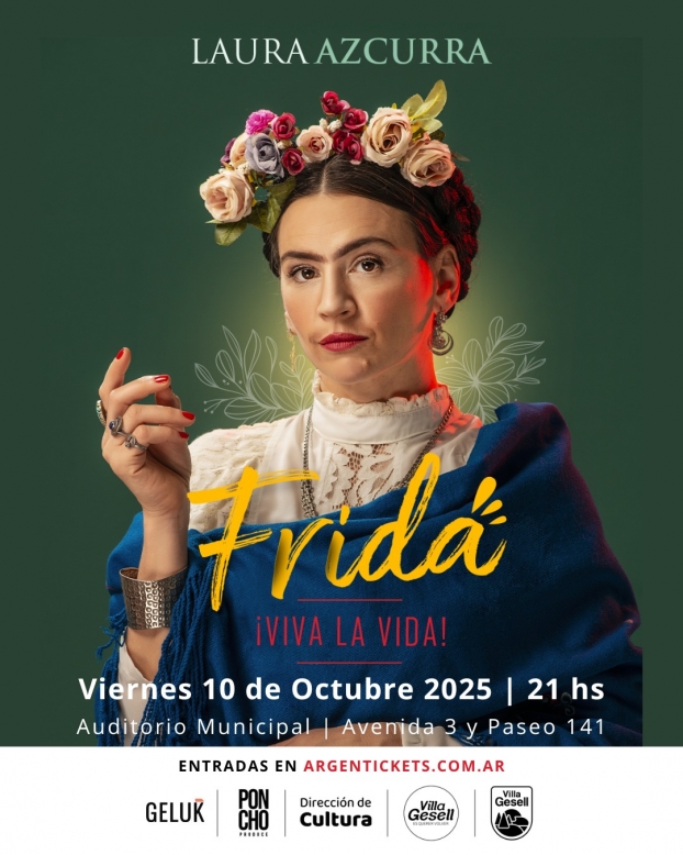 El unipersonal sobre Frida Kahlo más representado en el mundo llega a Villa Gesell de la mano de la reconocida actriz Laura Azcurra. La obra se presentará el viernes 10 de octubre, a las 21:00 h, en el Auditorio Municipal, ubicado en Avenida 3 y Paseo 141.