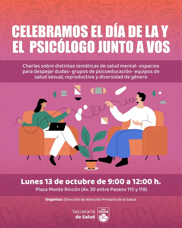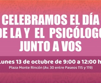 En el marco del Día del Psicólogo, la Dirección de Atención Primaria de la Salud llevará a cabo una jornada bajo el lema “El Día del Psicólogo junto a vos”, que se desarrollará el lunes 13 de 9:00 a 12:00 h en la Plaza de Monte Rincón (Avenida 30 entre Paseos 115 y 119).