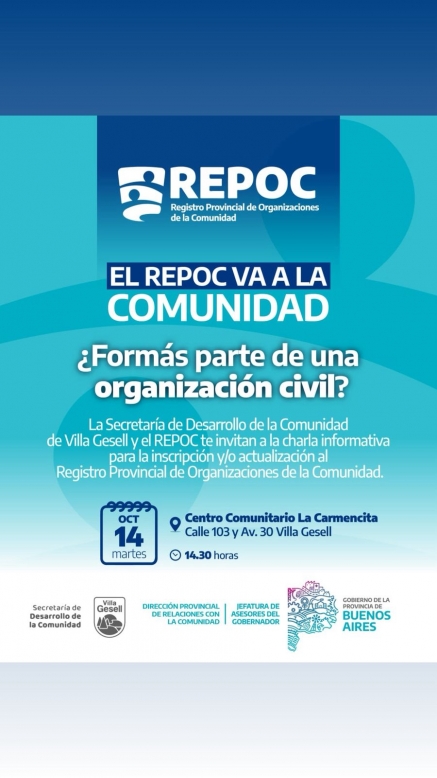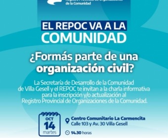 El Registro Provincial de Organizaciones de la Comunidad junto a la Secretaría de Desarrollo de la Comunidad municipal invitan a una charla informativa para la inscripción o actualización al REPOC. Será el martes 14 de octubre, a las 14:30 h, en el Centro Comunitario La Carmencita de Avenida 30 y Paseo 103.