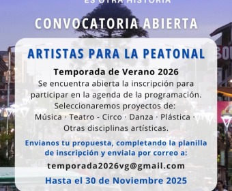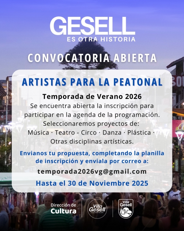 la apertura de inscripción para artistas callejeros, en todas sus expresiones: música, teatro y circo, danza, plástica y otras disciplinas artísticas. Podrán participar quienes deseen desarrollar su actividad en la peatonal de la Avenida 3 del Partido de Villa Gesell, de acuerdo con lo establecido en la Ordenanza N° 2474/12 – Artistas Callejeros.