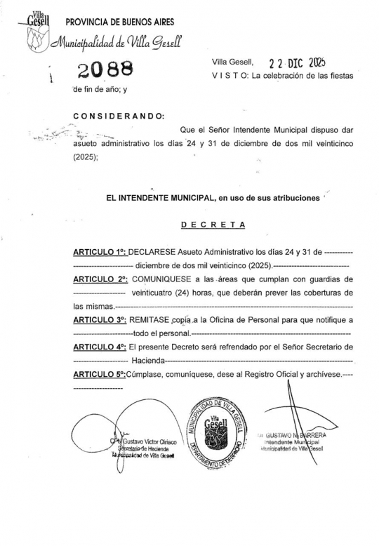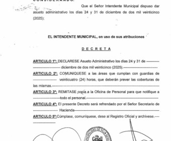 La medida fue dispuesta mediante el Decreto N.º 2088, firmado por el Intendente Municipal Gustavo Barrera, mediante el cual se establece asueto administrativo para ambas jornadas.