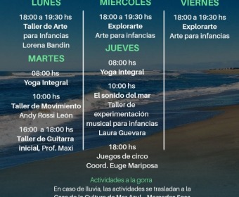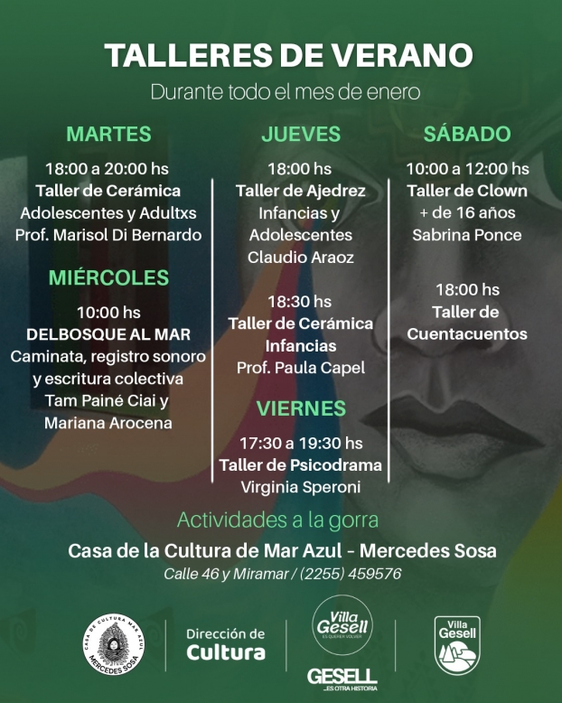 La Dirección de Cultura anuncia una variada propuesta de talleres de verano y actividades en la playa, impulsadas por la Casa de la Cultura de Mar Azul “Mercedes Sosa”. Las iniciativas, a la gorra, están destinadas a todas las edades e incluyen cerámica, ajedrez, clown, escritura, caminatas creativas, yoga y talleres artísticos para infancias, entre otras opciones.