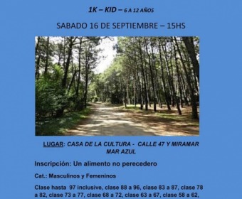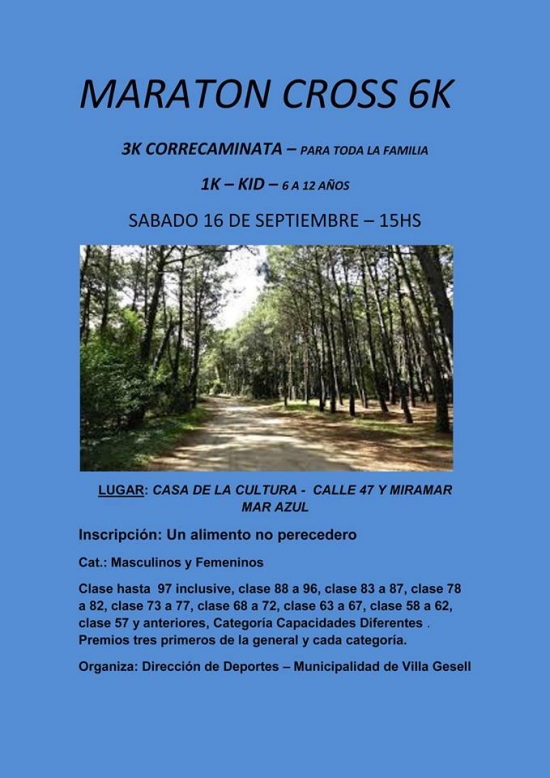 El sábado 16 de septiembre a partir de las 15 hs. en la Casa de la Cultura de Mar Azul, ubicada en Calle 47 y Miramar, se llevará a cabo la 4ª fecha del Maratón Cross. La inscripción para la prueba de 6 kilómetros, será un alimento no perecedero. Esta 4ª fecha, también tendrá la prueba de 1 kilómetro para chicos de 6 a 12 años, y una caminata de 3 kilómetros para toda la familia. En la parte competitiva se entregarán premios a los tres primeros de cada categoría, como también, la fecha servirá para sumar puntos en la tabla por acumulación de puntos. Para el campeonato es obligatorio correr tres carreras como mínimo.