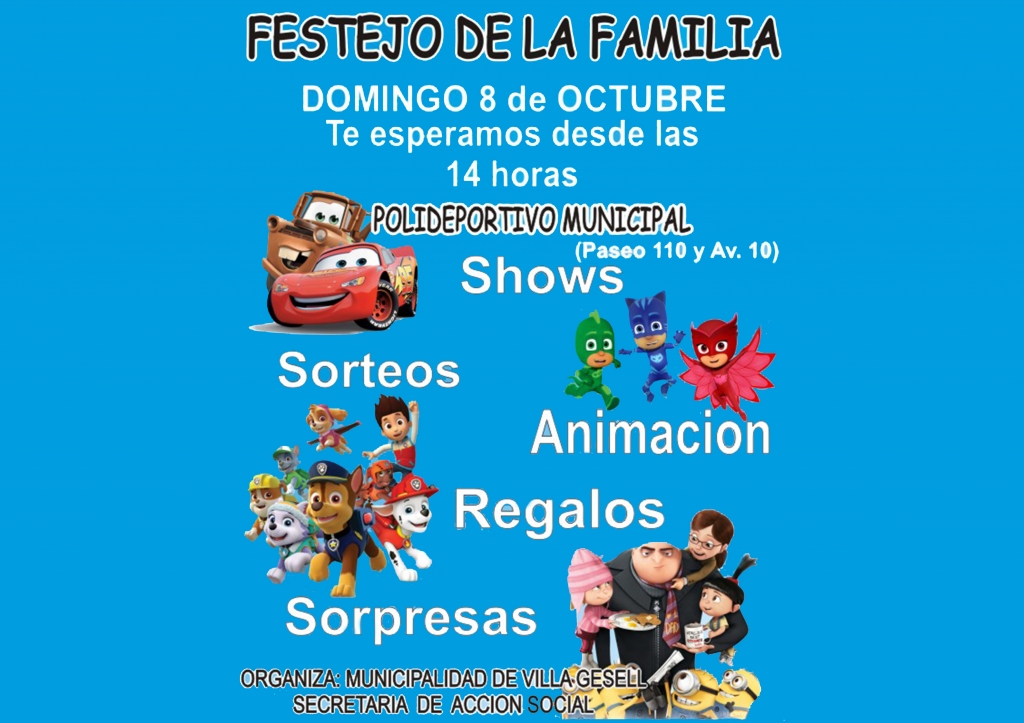 La Municipalidad de Villa Gesell, a través de la Secretaría de Acción Social, realizará este fin de semana el “Festejo de la Familia”, un encuentro que busca agasajar a los chicos a través de shows, sorteos, animación y más sorpresas programadas. La cita será este domingo, a partir de las 14 hs., en el Polideportivo Municipal (Paseo 110 y Av. 10). La jornada estará amenizada por grupos musicales para que los niños y sus acompañantes, pasen un gran domingo en familia.