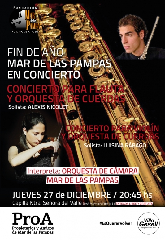 En esta oportunidad, la "Orquesta de Cámara Mar de las Pampas en Concierto" realizará una función musical para flauta y orquesta de cuerdas con el artista invitado, Alexis Nicolet (Concierto para flauta y orquesta de cuerda) y la artista Luisina Rábago (Concierto para violín y orquesta de Cuerdas). La entrada al espectáculo será libre y gratuita.