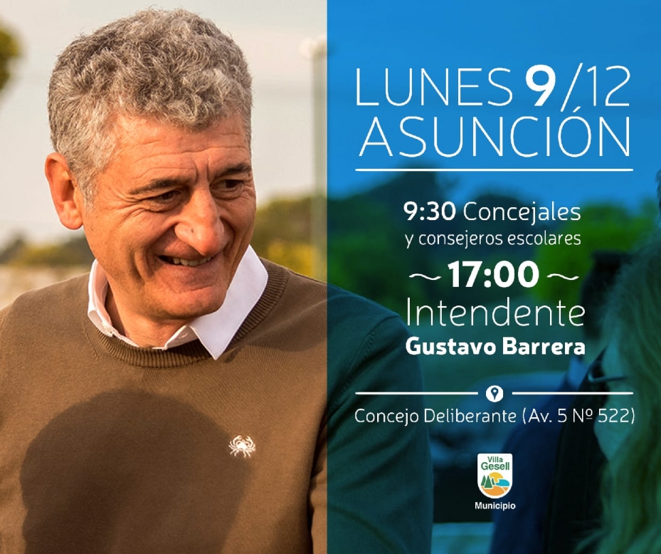 El acto se realizará este lunes 9 de Diciembre en el Concejo Deliberante (Av.5 N° 522) en dos horarios. A las 9,30 toman sus bancas los ediles y consejeros escolares electos, mientras que a las 17 asume el intendente Gustavo Barrera, quien tomará su segundo mandato consecutivo.