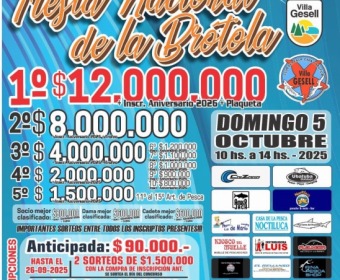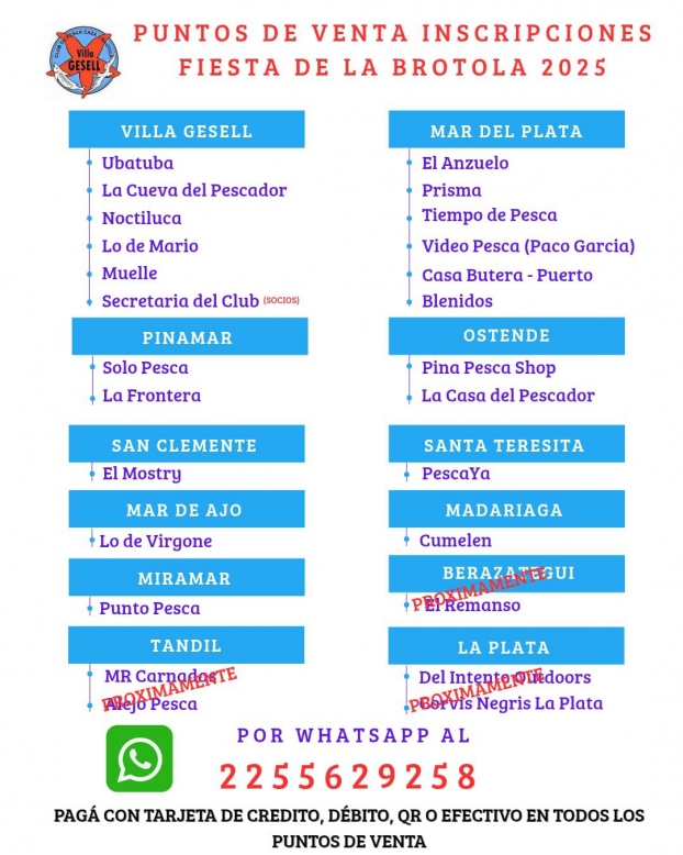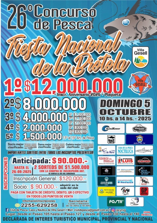 Para información e inscripción la Fiesta Nacional de la Brótola declarada de interés turístico municipal, provincial y nacional, comunicarse por Whatsapp al 2255 629258 o vía mail a clubdepesca@gesell.com.ar.
