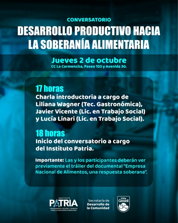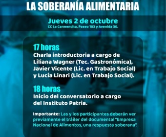 La actividad comenzará a las 17:00 h con una charla a cargo de Liliana Wagner (Técnica Gastronómica), Javier Vicente (Licenciado en Trabajo Social) y Lucía Linari (Licenciada en Trabajo Social). A las 18:00 h se dará inicio al conversatorio principal coordinado por el Instituto Patria.